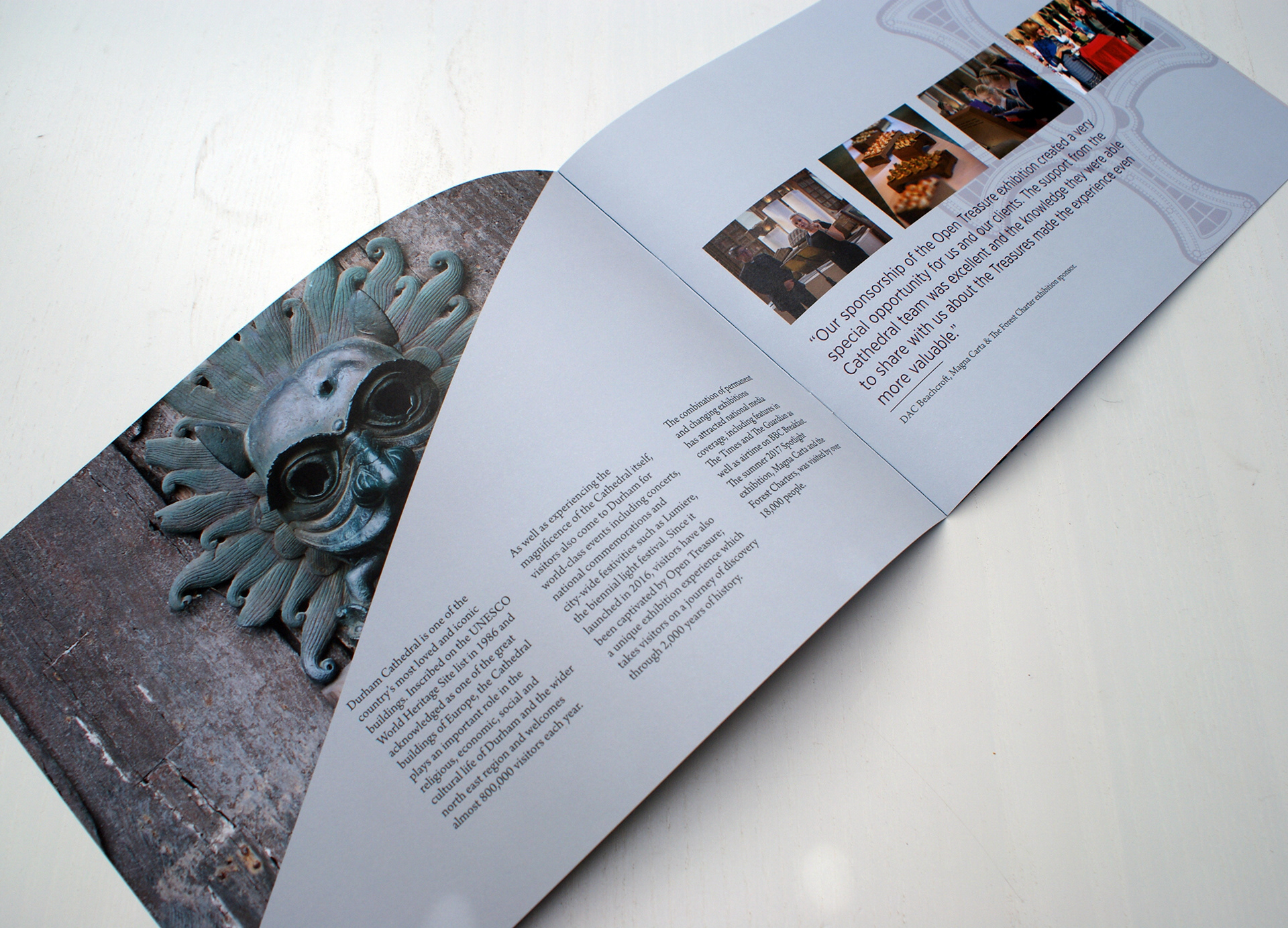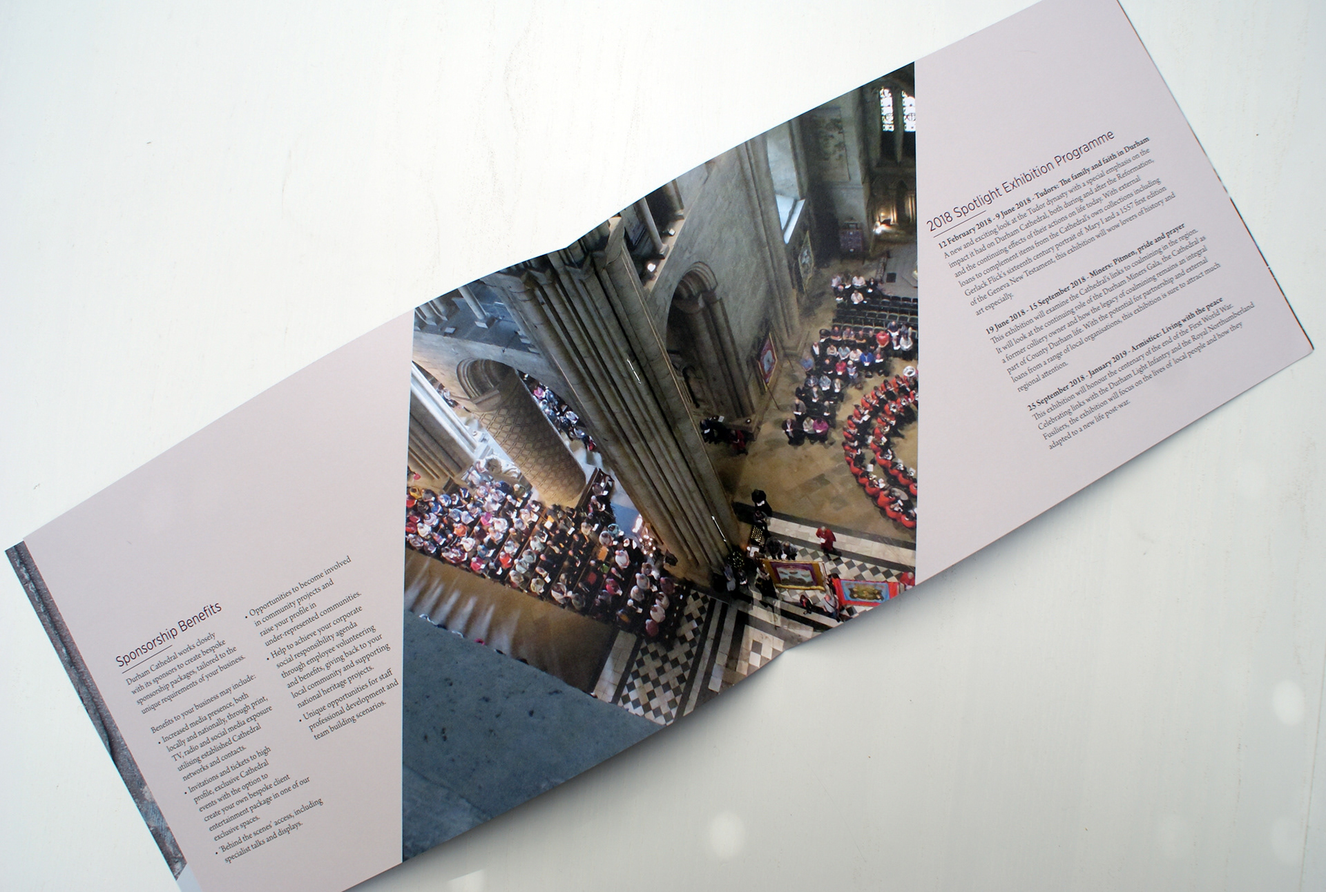 Brochure design for Durham Cathedral to promote corporate sponsorship. The cathedral is one of the country's most loved and iconic buildings, the brochure was to follow the current brand guidelines in the use of colour and font but needed to stand out on it's own. What we did: Graphic Design | Print Management